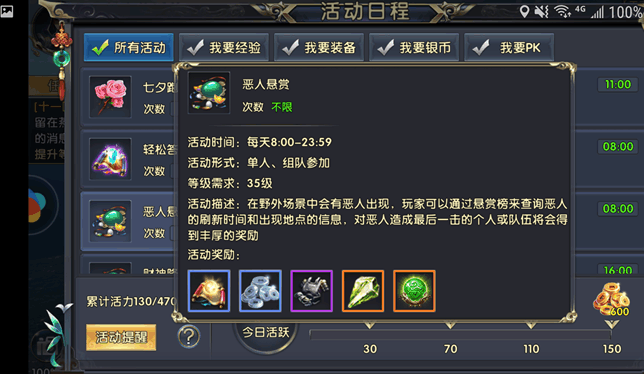 悬赏恶人任务会在每日上午8:00至晚上23:59开放,每一小时刷新一次。当玩家等级到达35级时,便可接取悬赏任务击杀榜上恶人。参与该任务可选择个人前往或组队配合,活动开始前5分钟系统会自动提示,玩家只需点击“寻路”即可自动寻路前往恶人所在地图挑战。击杀会获得超丰厚的经验,你输出的伤害越高,获得的经验越丰厚,也就是说你实力越强,经验就会越多。