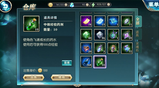 点击【出售】,可以将仓库中的物品卖出,获得金币收入,暂时用不到的物品,就赶紧卖出吧,金币可是很重要的呢。点击【使用】,可以直接将经验药水用于等级提升,真是太方便了!