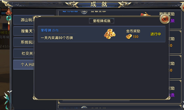 里程碑属于成就的个人兴趣部分,具体要求是要玩家在一天内采集50个石碑即可激活成就,同时还能获得额外金币奖励。这个成就总的来说应该是成就系统中最简单的,不花钱也不费力气,只要在一天内采满石碑就行,对于成就爱好者来说千万不要错过哦。那么如何去完成这个石碑采集的次数呢?这就是本文的介绍重点,接下来会详细说明。