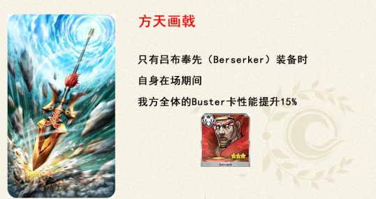 吕布羁绊礼装与列奥尼达一世礼装效果相同,都是全体的红卡强化,但因为是狂阶本身生存能力低而且没有保命技能。