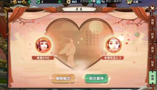 在选择暗恋对象,打开姻缘系统会出现爱神,点击爱神就可以进入琳琅洞天。