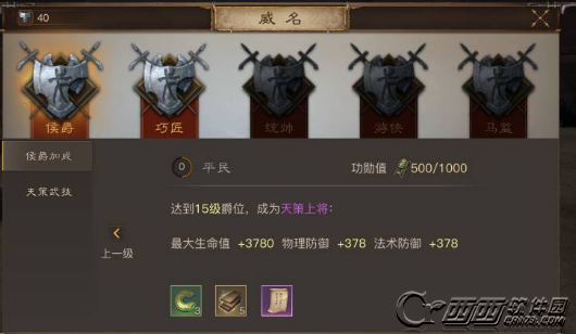 提升自身的侯爵等级后,可以获得对应爵位的属性,每升级一次也可以获得封赏。