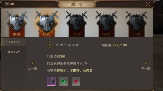 提升巧匠等级可以提升打造获得紫装的概率,也可以开采高级矿石。