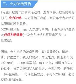 9月底开放周年庆系列活动时,游戏内将开放新的补给形式--火力补给。火力补给开启前,会公布火力补给可以获得的所有装备。