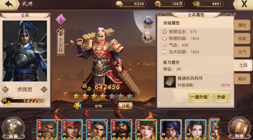 每一名武将在一骑当千2中都统帅着一只军队,这也是游戏中非常重要的一个玩法。在战斗中士兵将听从武将的指挥,完成冲锋、绕后等指令,所以士兵和武将的战力是合并计算的,升级士兵不但可以直接增加主人的战斗力,还可以帮助主人进行战斗,可谓是一举多得。特别是在游戏一些阵法内,一群士兵困住敌将,保证我方远程武将的输出,简直不能更好用了。士兵的等级是跟随武将提升的,所以在武将等级提升的同时,不要忘记升级自己的士兵哟。