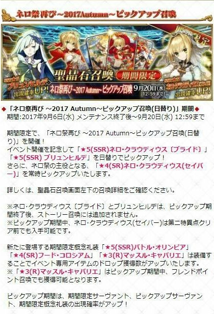 「尼禄祭再临~2017 Autumn~UP卡池」(日替)