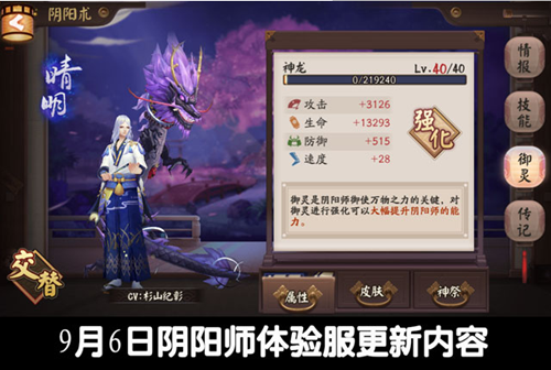 *9月6日维护更新后,神祭系统将开启,各位阴阳师大人可通过对御灵的强化来提升四位主角们的能力 。