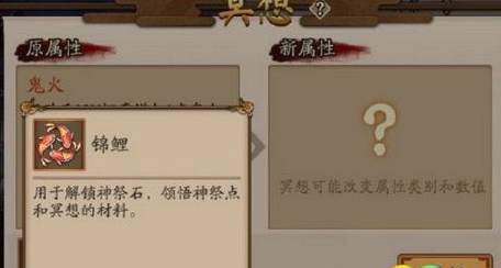 通过材料“锦鲤”可以激活神祭技能(每次消耗*1),激活后可以使用“锦鲤”进行冥想,每次冥想会有不一样的效果可自己选择一个保留(每次消耗*1)。