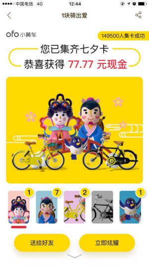 活动截止时间9月6日23:59,截至9月5日16:00,已经有近24万人集齐ofo七夕五卡,成功赢得77.77元现金大礼!