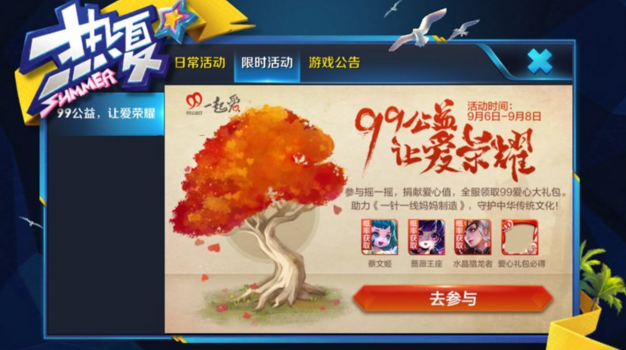 活动面板,在上方日常活动旁边会启动一个限时活动,点击99公益就能捐献爱心,获得礼包。因为这个活动是全服性质,会按照区服逐步开放。
