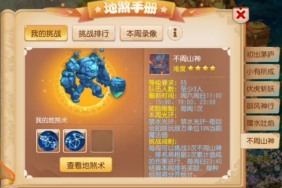 玩家需要等到活动结束,也就是每周日23:40分以后到“地煞手册”——不周山神——挑战排行查看,关于伤害问题也给大家解释一下: