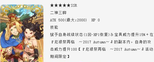 FGO二神三脚礼装的技能,增加自身攻击威力,能够提高玩家完成尼禄祭再临 2017 Autumn活动的效率,值得入手。