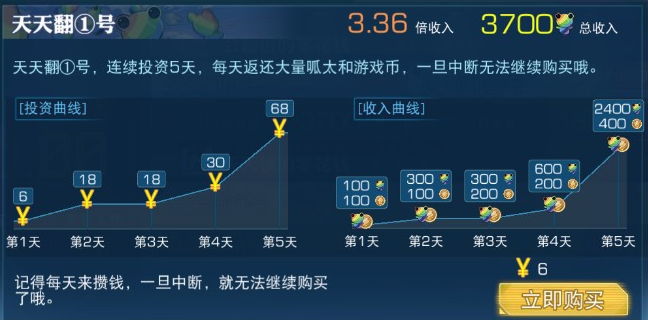 天天翻1号:注意第一种天天翻等于和理财差不多。每天都要买。然后一期给你多少东西这样。中间断掉了就重头开始了。
