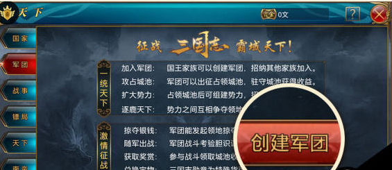 在三国志大陆中,初期军团没有城池的情况下,对所有军团随机分配到边城。且一个边城初始存在多个军团, 刺激 军团之间竞价攻占。竞价前两名军团进行战队,胜利者占领当前边城,战败军团可选择归顺中央军团。随着对城池占领数量的增多,中央军团将成为一个愈加庞大的战争机器。