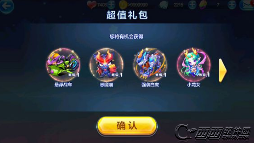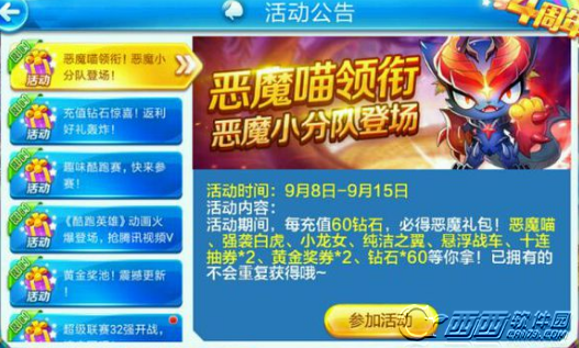 活动内容:活动期间,每累计充值60钻石,即可获得一个随机礼包,随机礼包有概率抽出恶魔喵、强袭白虎、小龙女、纯洁之翼、悬浮战车、十连抽券*2、黄金奖券*2或钻石壕礼哦~