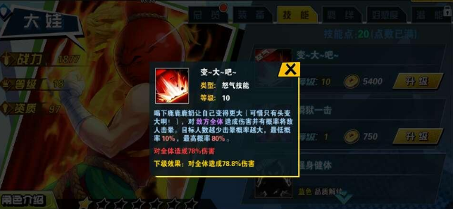 大娃的怒气技能 变大吧 和普攻技能可以对对方全体进行眩晕 并且对方人数越少眩晕几率越大 此技能虽然伤害不高 但是对敌方进行有效控制 减少敌方输出