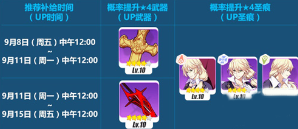 活动期间,★4武器「藏锋」「雷切」「蚩尤巨炮」等、★4圣痕「伏羲」「叶卡捷琳娜」等也将加入本期精准补给,其中「鲜血之舞」将与「犹大的誓约」均有获取概率相对更高的推荐补给时间(即轮流UP)。