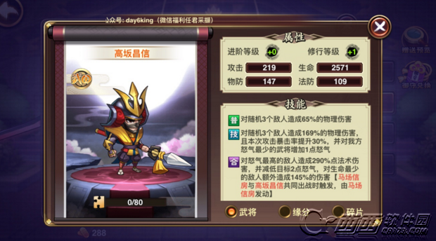 星期六魔王高坂昌信怎么样,星期六魔王高坂昌信属于武田阵营橙色武将之一,高坂昌信技能可以对随机3个敌人造成物理伤害,非常不错的aoe效果,还增加怒气值,那么星期六魔王高坂昌信怎么样,西西带来高坂昌信属性技能介绍,希望对大家有所帮助。