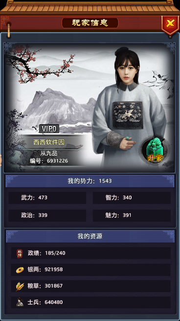 最后,武力最关键,智力多钱多,政治多粮多,魅力多兵多,兵产多少消耗多少粮,点击自己头像就能知道自己的编号了。