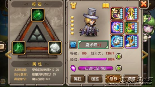 加上魔术师的神器技能需要更快更多次的释放大招,所以受伤回能与能量消耗降低就成了魔术师的第一首选符石,晨星增加法强即可。