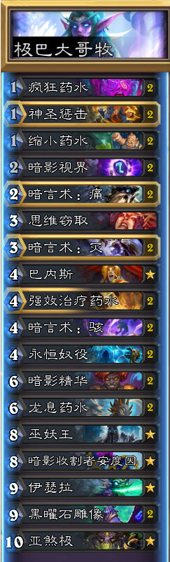 说说牧师内战,起手全力找巴内斯,暗影精华,永恒奴役,不要怕对面压场,你解牌那么多,而且宇宙牧前期生物都是以过牌护脸为主,没啥进攻性的,