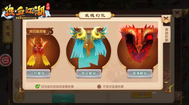 武魂升阶不仅能大幅提升属性效果,还可解锁更多酷炫外形,当武魂升至五阶、八阶、良品、圆满时,及可解锁对应形象。