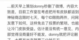 有热心的玩家发现了前几天策划donny秒删了微博,内容大概是目前工作室考虑吧所有皮肤都返场到神秘商店,限时7天,每个ID限购两件,问网友意下如何,这样免去了投票的繁琐,也能让冷门皮肤受益。