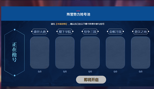 6. 号码池一共包含:盛世大唐,稷下学院,纷争三国,金帐汗国,楚汉之地5个阵营,每个阵营所开放的抢号数量并不一致,期望大家在体验服能为您的阵营