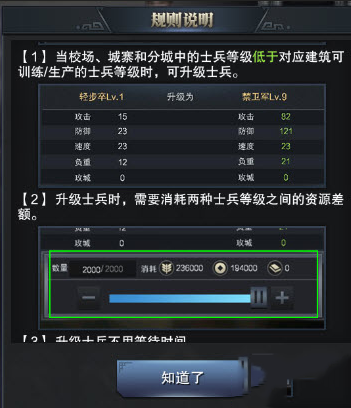 1.当校场、城寨和分城中的士兵等级低于对应建筑可训练/生产的士兵等级,可升级士兵。