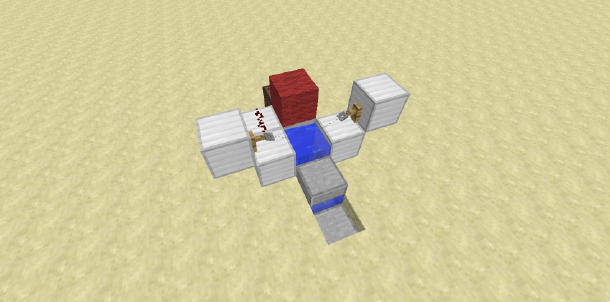 如图第一格放下半砖,这里为玩家挂机点,放下挡水流的方块(不一定为羊毛),随意一侧在挡水流方块后放一个充能方块,放铁门水流