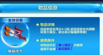 蝙蝠排气是南瓜魔铁的一个坐骑配饰,可以提升南瓜魔铁的表现分,适合超级奖励关内加成较高的角色。