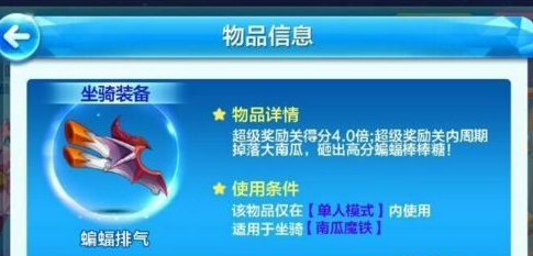 蝙蝠排气是南瓜魔铁的一个坐骑配饰,可以提升南瓜魔铁的表现分,适合超级奖励关内加成较高的角色。