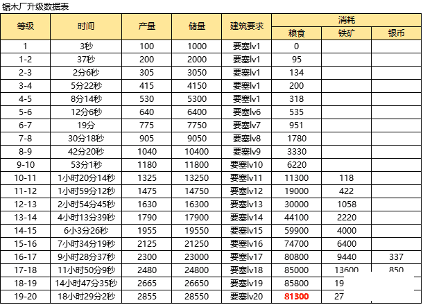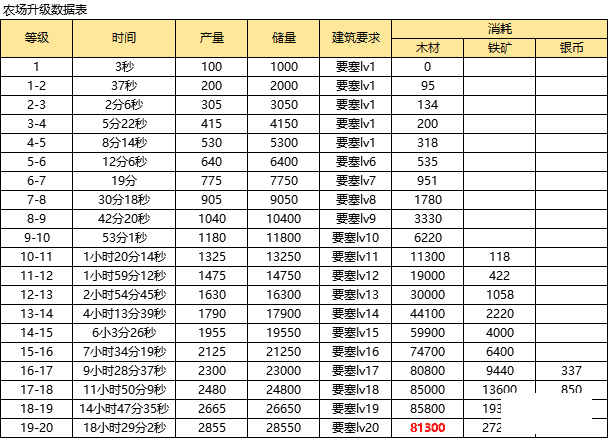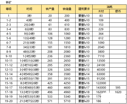 铁矿/银矿/锯木厂/农场1-20级升级需求表