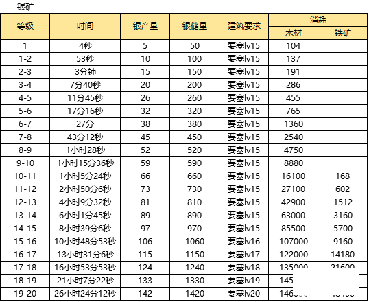 以上就是小编带来了阿瓦隆之王1-20级升级需求表大全,铁矿/银矿/锯木厂/农场1-20级升级需求表