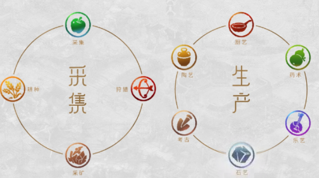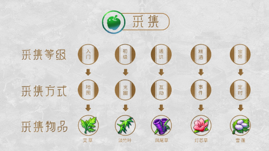 采集业分为采集、耕种、狩猎和采矿四种,采集获得的基本是植物,狩猎的话应该是“荤类”,耕种的话预计是“五谷杂粮”、采矿一般是指各种矿石吧,官方还没有公布具体获得的道具,只有采集到的物品有放出图,如下所示: