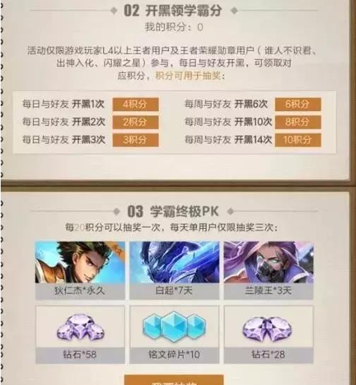 这个活动的奖品是永久英雄狄仁杰。活动参与条件还好,邀请小伙伴一起玩就行:完成开黑任务获取积分,使用积分参与抽奖。