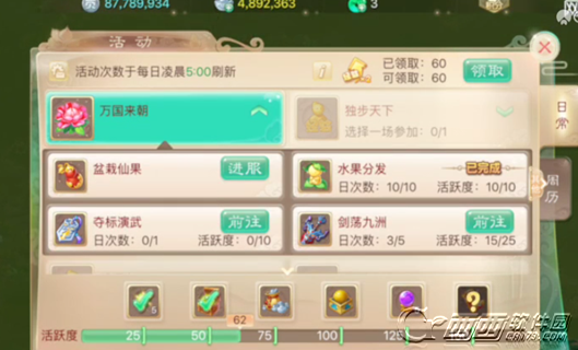 果实成熟以后玩家可以一次性把仙果都采摘完(有几个就收几个),如果是其他玩家的只能偷走1个(不能重复偷,而且1个成熟果实最多被偷2次,玩家一天最多可以偷50个。)