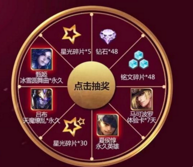 活动内容与奖品:在该页面充值超级会员,可获得3~5块星光碎片,使用1块星光碎片可以进行抽奖,抽奖池中有天魔缭乱*永久,还有冰雪圆舞曲*永久、夏侯惇*永久,其次星光碎片*40可以兑换超时空战士*永久和钟馗*永久。