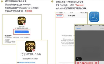 使用您下载TestFlight的iOS设备登录Testflight,点击“Redeem”,输入邮件中激活码即可下载测试APP。