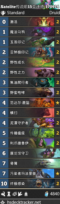 来自Satelite的传说前15变速德,架构上有点类似于中速德,但是带了更多的低费生物,顺利的话前期就能抢到不少节奏