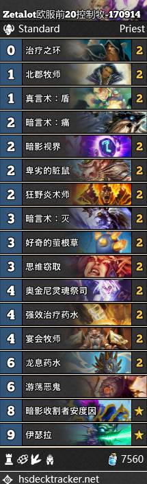 来自牧神Zetalot的控制牧,不太推荐没有牧师经验的人玩。思路上回归到了最初的奥金尼+环,而放弃了缩小+骇