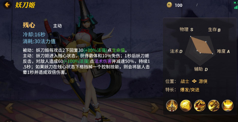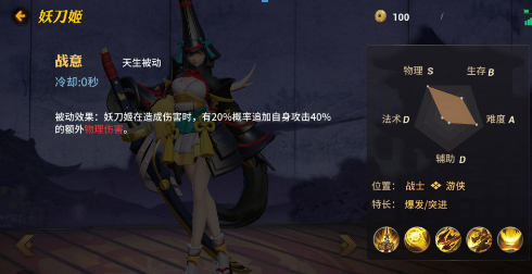 被动解析:这个被动技能十分厉害,被动注定了妖刀姬是一名叠加攻击力的式神,20%概率追加40%的伤害是什么概率?这个伤害是非常可观的,就好比是暴击伤害一般,一不小心就被妖刀姬给秒杀了。