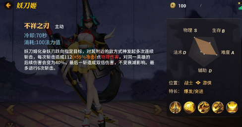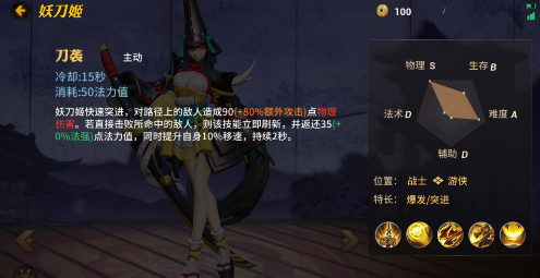 一技能解析:妖刀姬的一技能很像新版剑姬的Q技能,对路径的敌人发起攻击,只要能够攻击到敌人就能立刻释放第二段一技能,并且这里是老版剑姬的Q技能,新老结合造就了妖刀姬的一技能,提升自身移速这个小BUFF加成很关键。