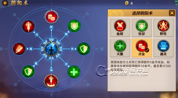 可以看到阴阳术有血怒,坚忍,野性,天惠,点金,通灵几种选择。