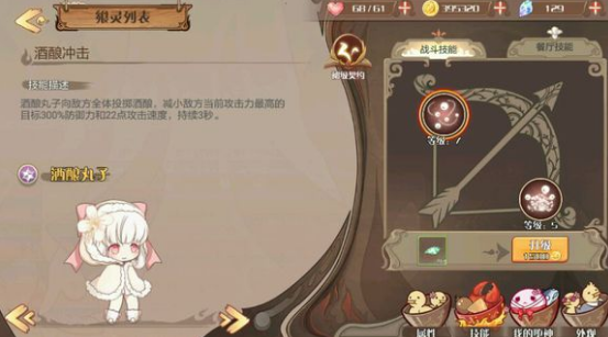 酒酿冲击:酒酿丸子向敌方全体投掷酒酿,减小敌方当前攻击力最高的目标x%防御力和x点攻击速度,持续3秒。
