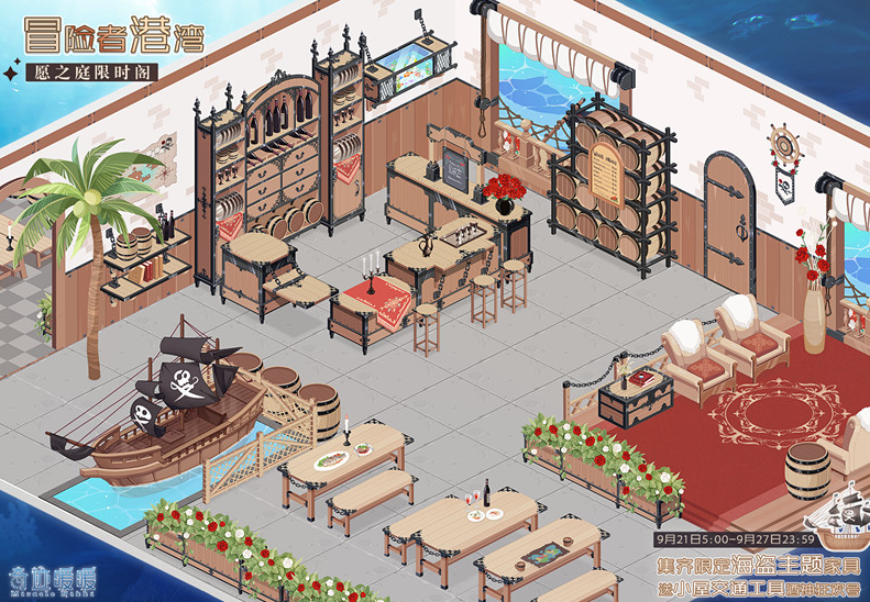 9月21日5:00—9月27日 23:59期间,在小屋愿之庭的限时奖阁【冒险者港湾】许愿,可获得精美气泡,送海盗主题家具!每2天可免费“许愿一次”,并半价“许愿五次”一次。