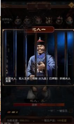 抓获的犯人可以在牢房中进行惩罚,消耗一定的名望,可以获得粮食、金钱、各种丹药、加红颜属性的道具、元宝、强化卷轴等等。每个犯人被惩罚后扣除的血量不一样,每打光一个犯人的血量才能继续惩罚下一个。