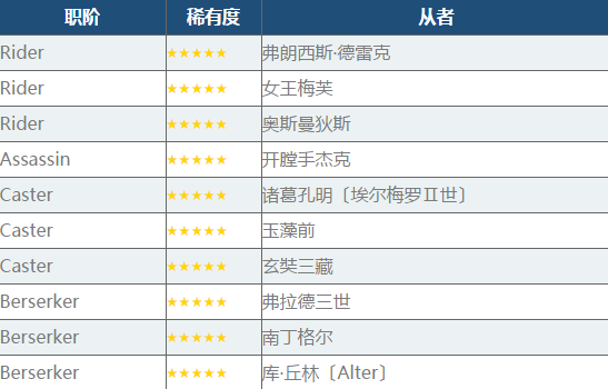 ※关于三星以及四星从者,可召唤的职阶也仅限于Rider,Assassin,Caster,Berserker。