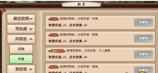 寻仙手游大荒兵录风物志是小伙伴们需要解锁的称号,因此不少小伙伴们想知道这个究竟怎么解锁,因此想知道的小伙伴们,就让小编给大家详细的讲讲吧,一起来看看吧。