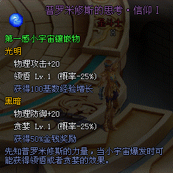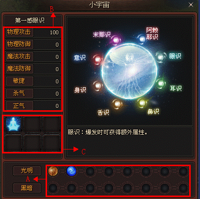 小宇宙属性球按属性分为物理攻击和防御、魔法攻击和防御。每种球只能镶嵌一次,而镶嵌在光明或黑暗上获得的效果是不同的。如下图所示: